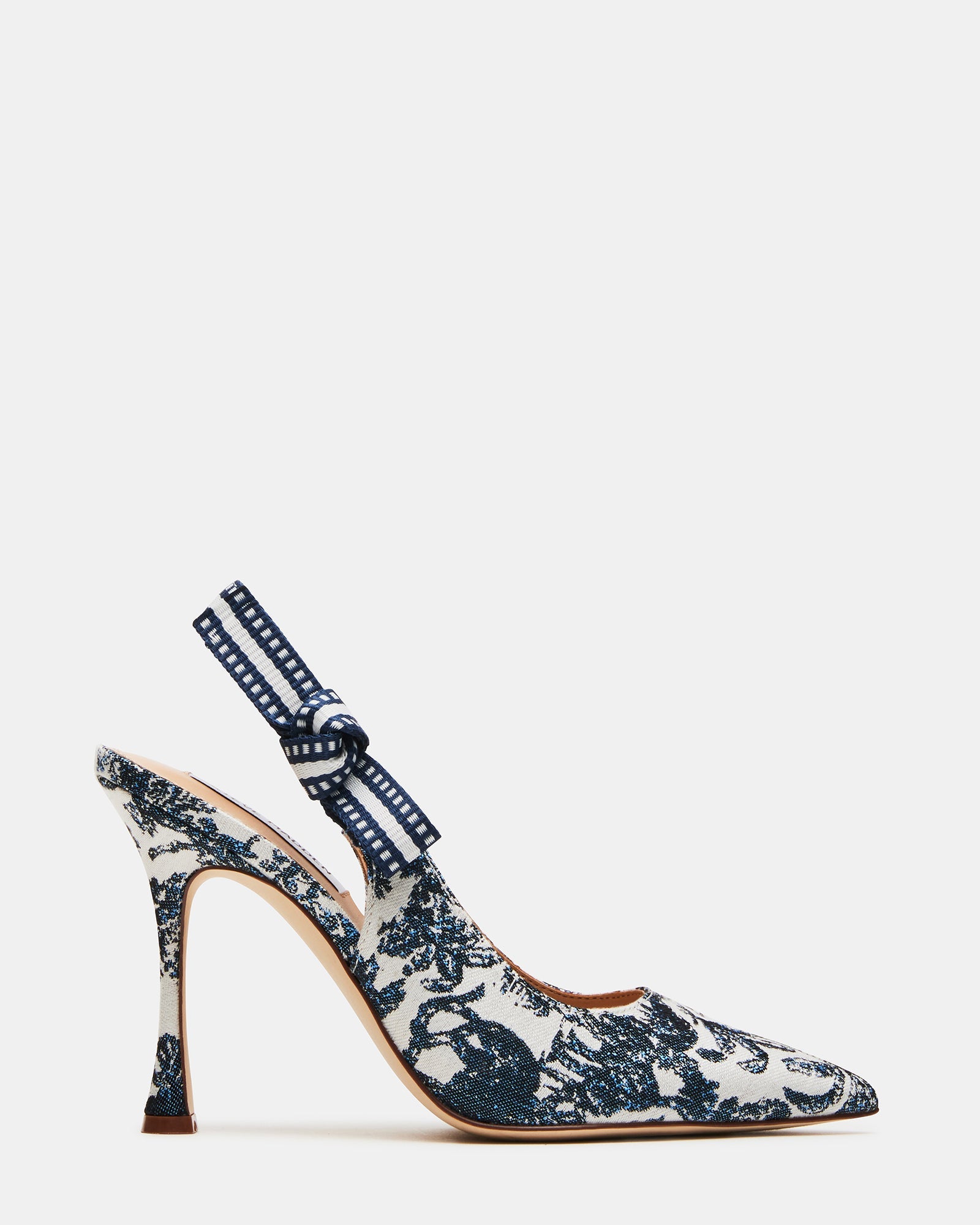 A grosgrain ribbon wraps around the slingback strap of the BRI point toe stiletto pump and finishes with a bow accenting the side of the shoe.