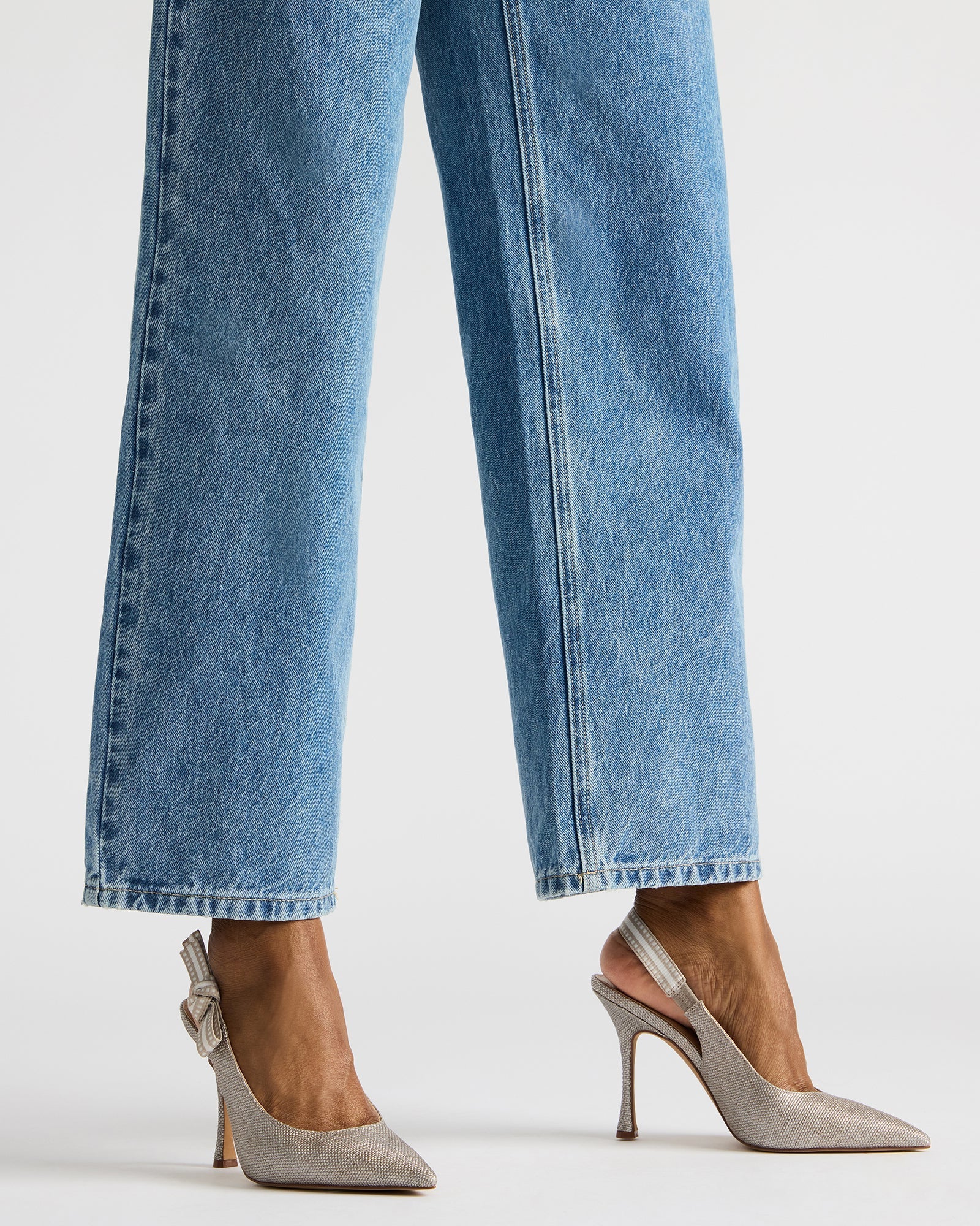 A grosgrain ribbon wraps around the slingback strap of the BRI point toe stiletto pump and finishes with a bow accenting the side of the shoe.