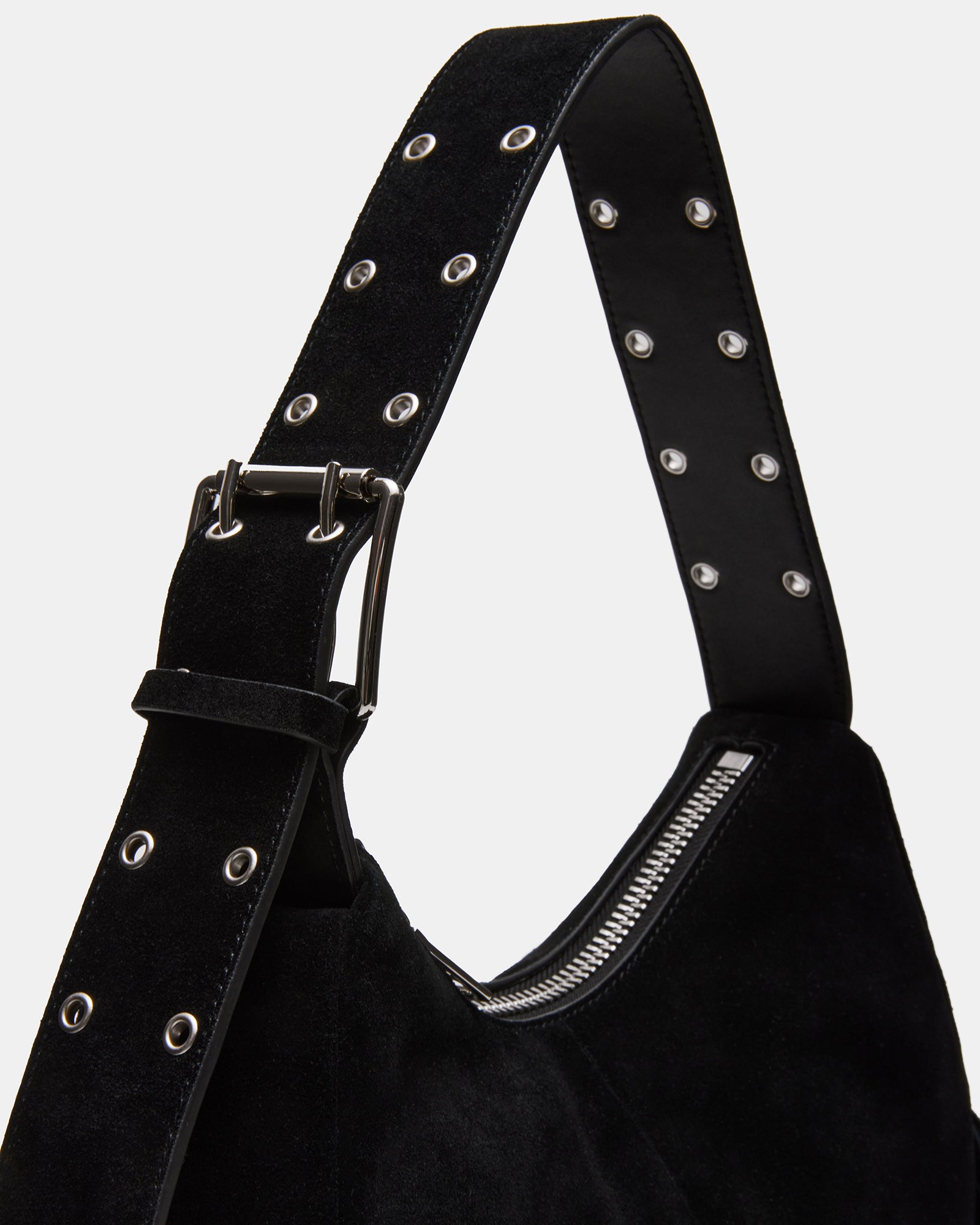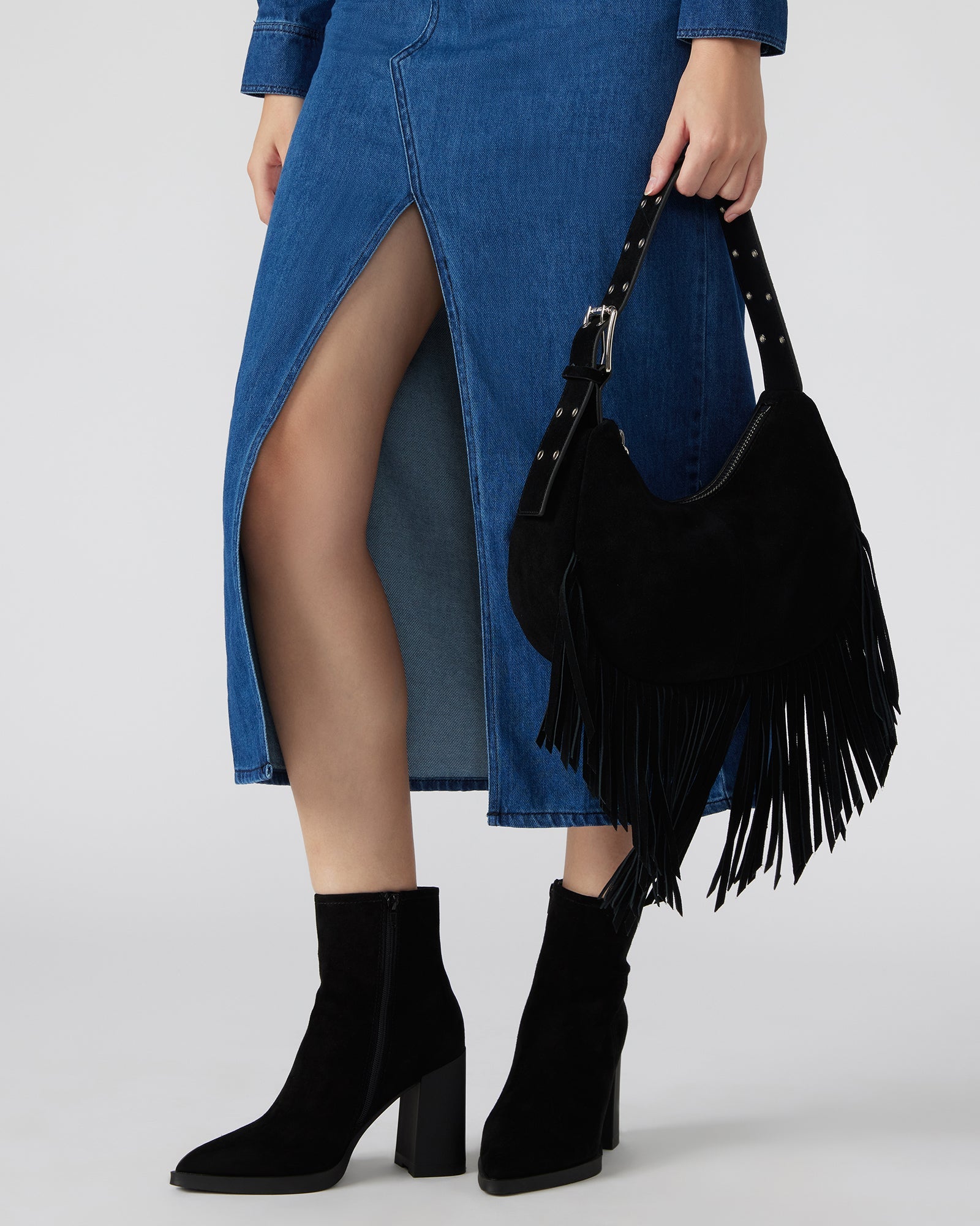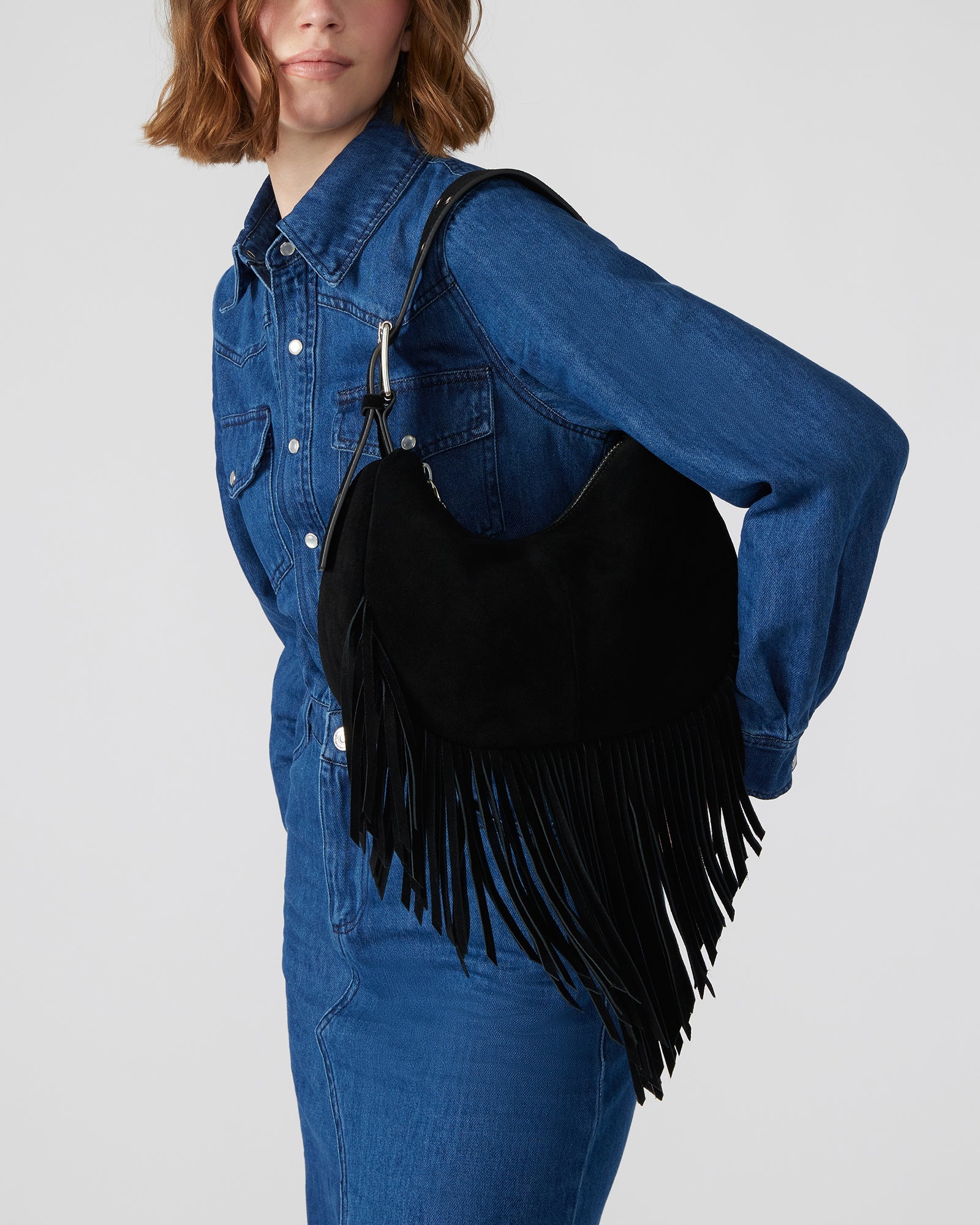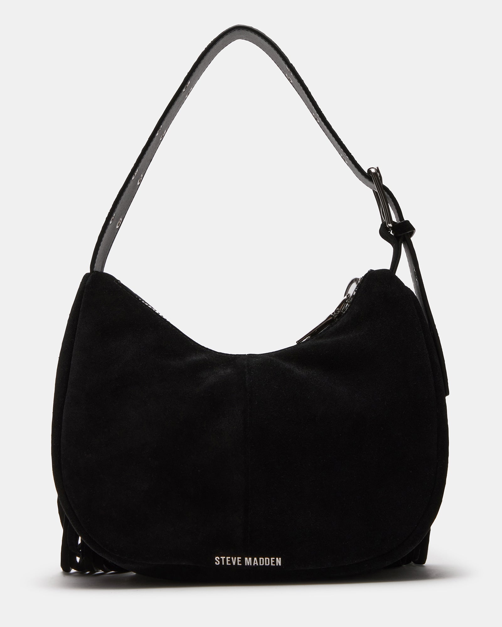 The SIENA bag is a stylish fringe shoulder-style hobo bag crafted with a zipper closure and adorned with buckle detail on the grommet shoulder strap. Perfect for any occasion, this bag is both functional and fashionable. Add some edge to your look with this must-have accessory.
