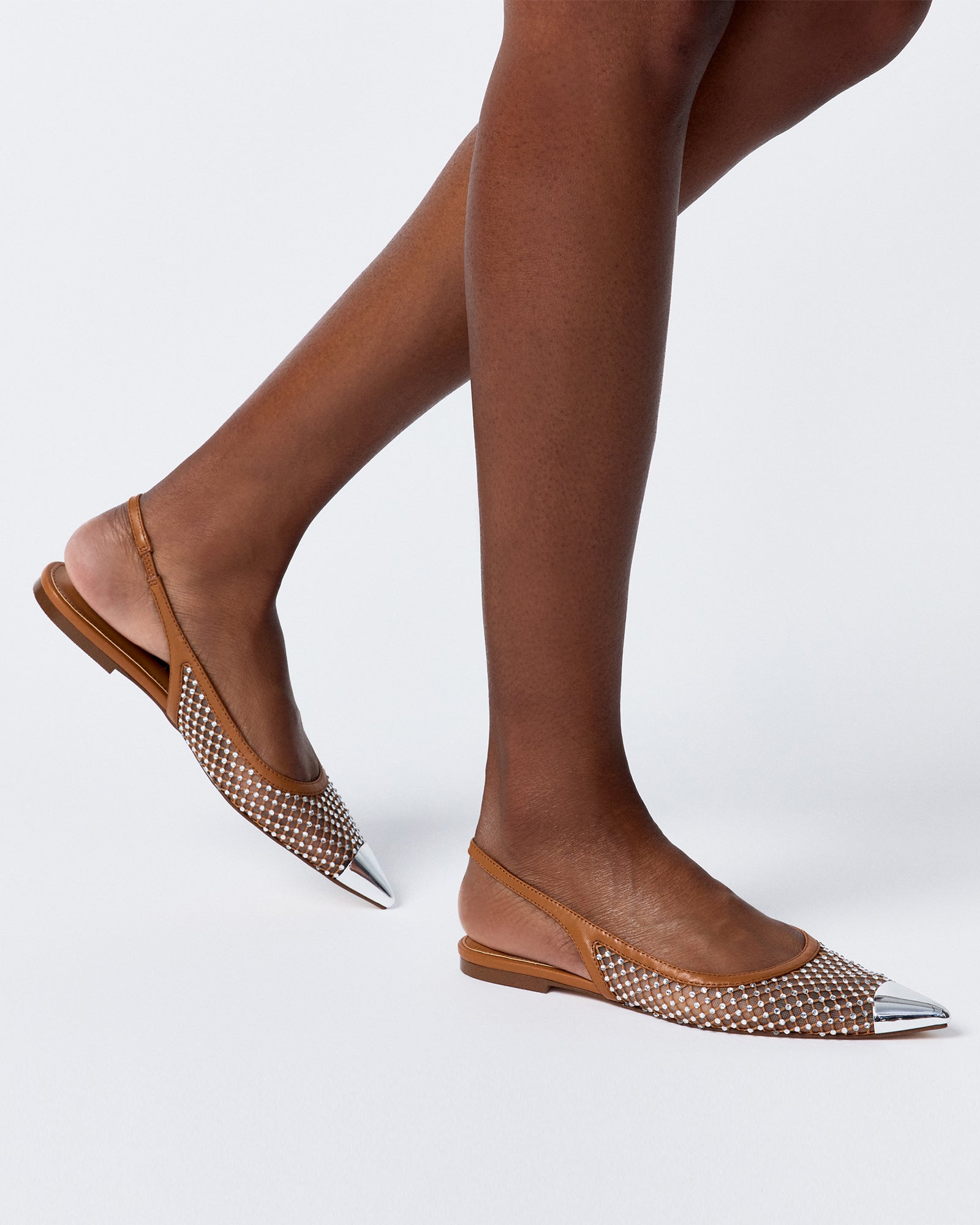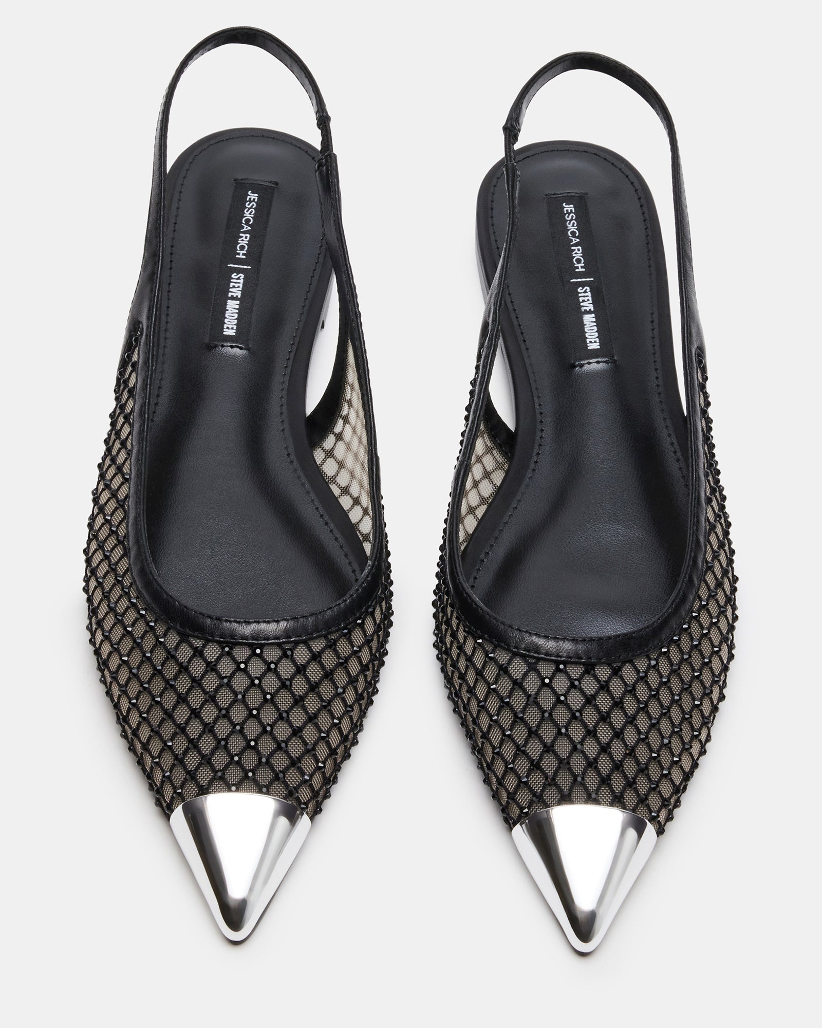 Elevate your style with the MARY. Featuring intricate mesh detail and a sleek silver toe cap, these pointed toe flats exude sophistication. The slingback design adds a touch of luxury, making them the perfect choice for any occasion.